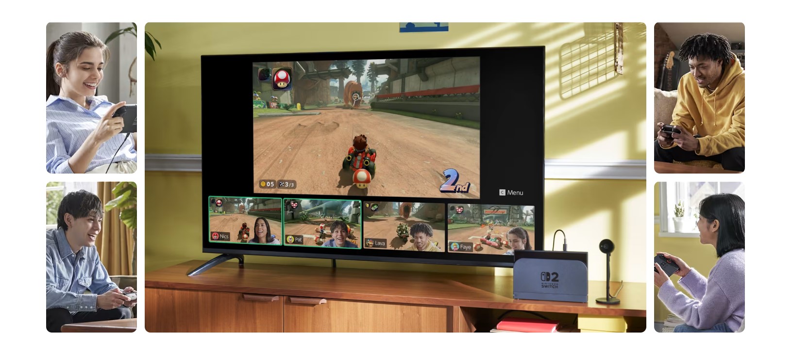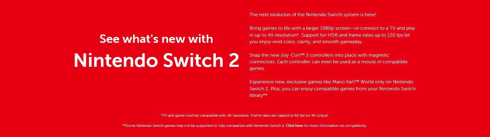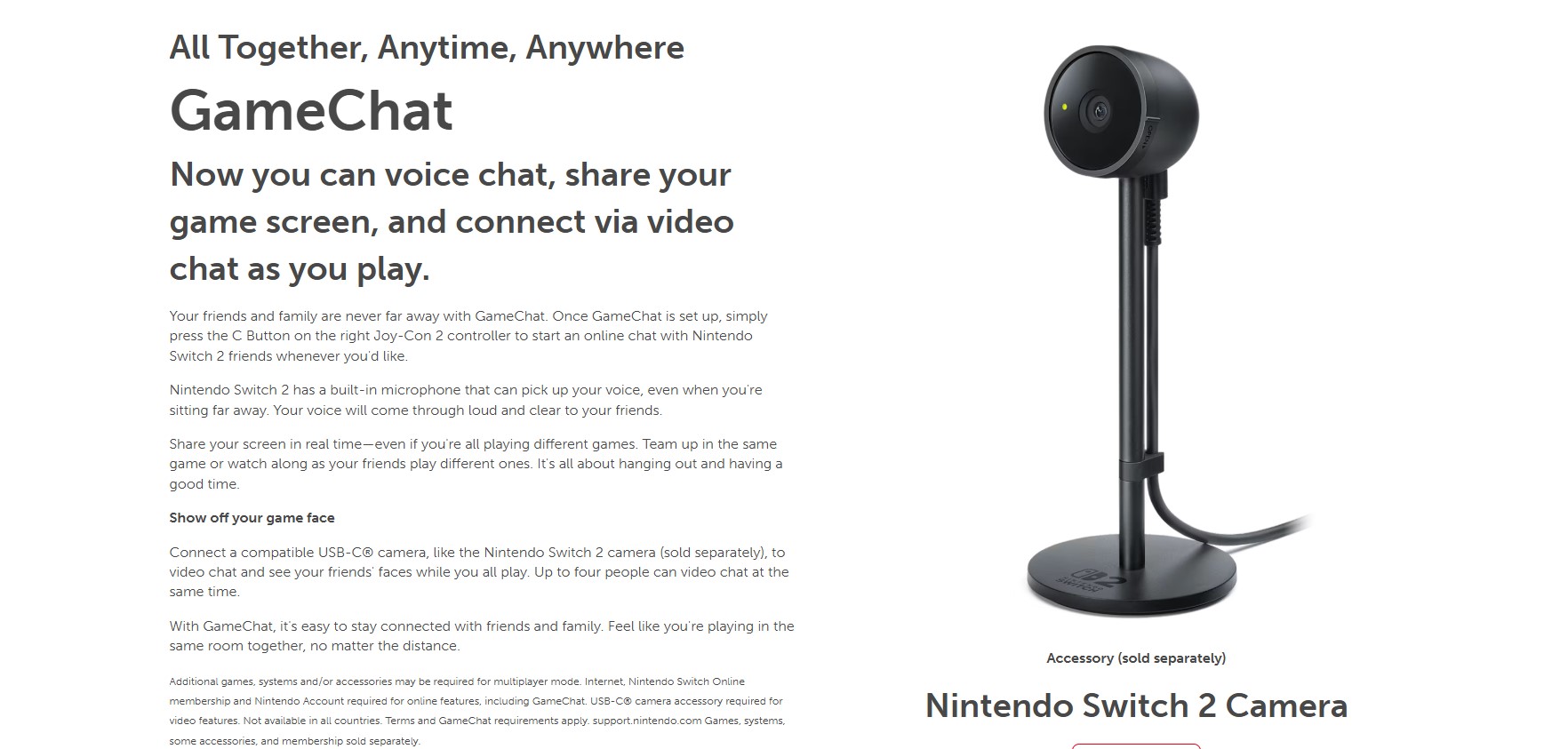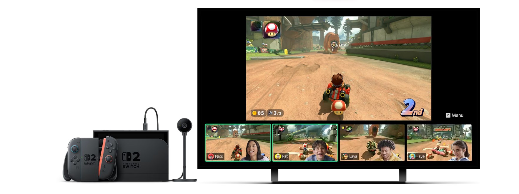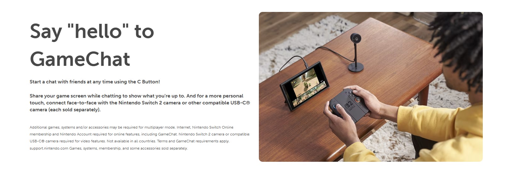 *Some Nintendo Switch games may not be supported or fully compatible with Nintendo Switch 2. **TV and game must be compatible with 4K resolution. Frame rates are capped at 60 fps for 4K output. ***Additional games, systems and/or accessories may be required for multiplayer mode. Internet, Nintendo Switch Online membership and Nintendo Account required for online features, including GameChat. Nintendo Switch 2 camera or compatible USB-C camera required for video features. Not available in all countries. Terms and GameChat requirements apply. Games, systems, membership, and some accessories sold separately.