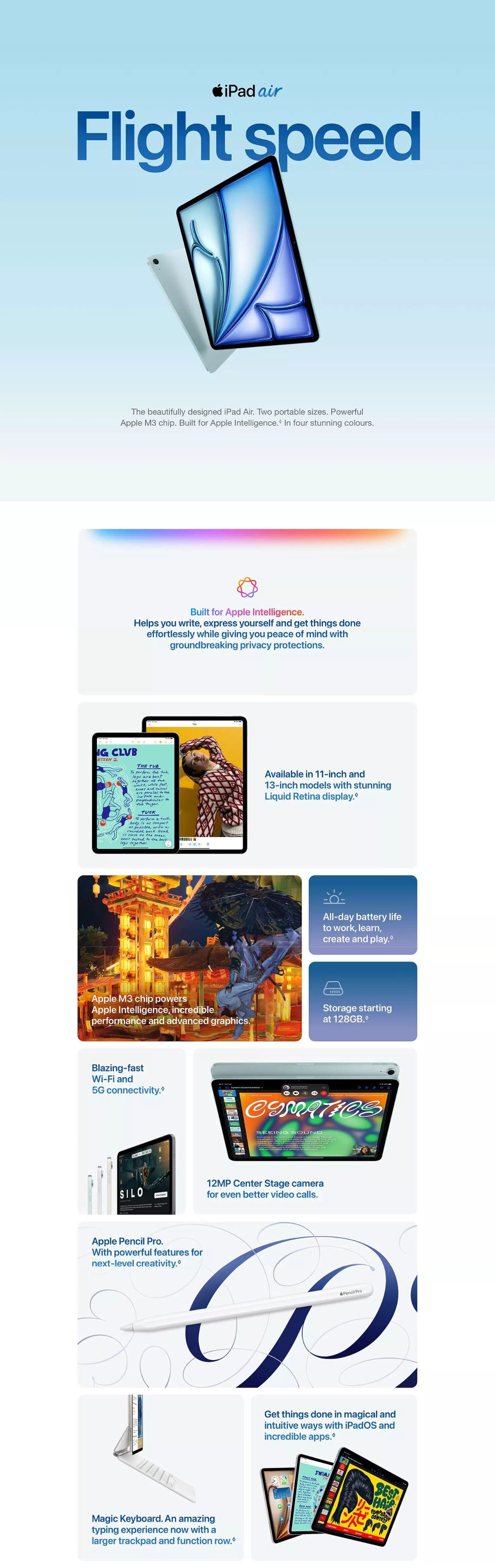 iPad Air. Dream big. The 11-inch iPad Air. Built for Apple Intelligence. Supercharged by the lightning-fast Apple M3 chip. It features a stunning Liquid Retina display, a 12MP Centre Stage front camera for even better video calls, and blazing-fast Wi-Fi 6E. And it works with Apple Pencil Pro, Magic Keyboard and Smart Folio, so you can multitask, study, work, play and create from anywhere.