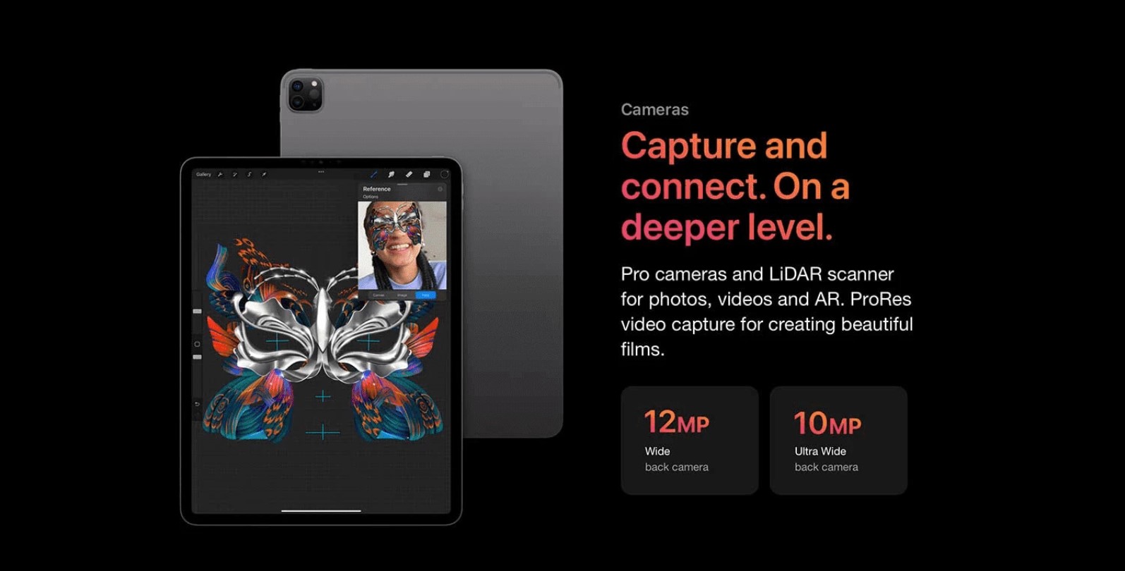 The pair of 10 and 12 MP cameras on the back can capture ProRes video and scan your surroundings with LiDAR.