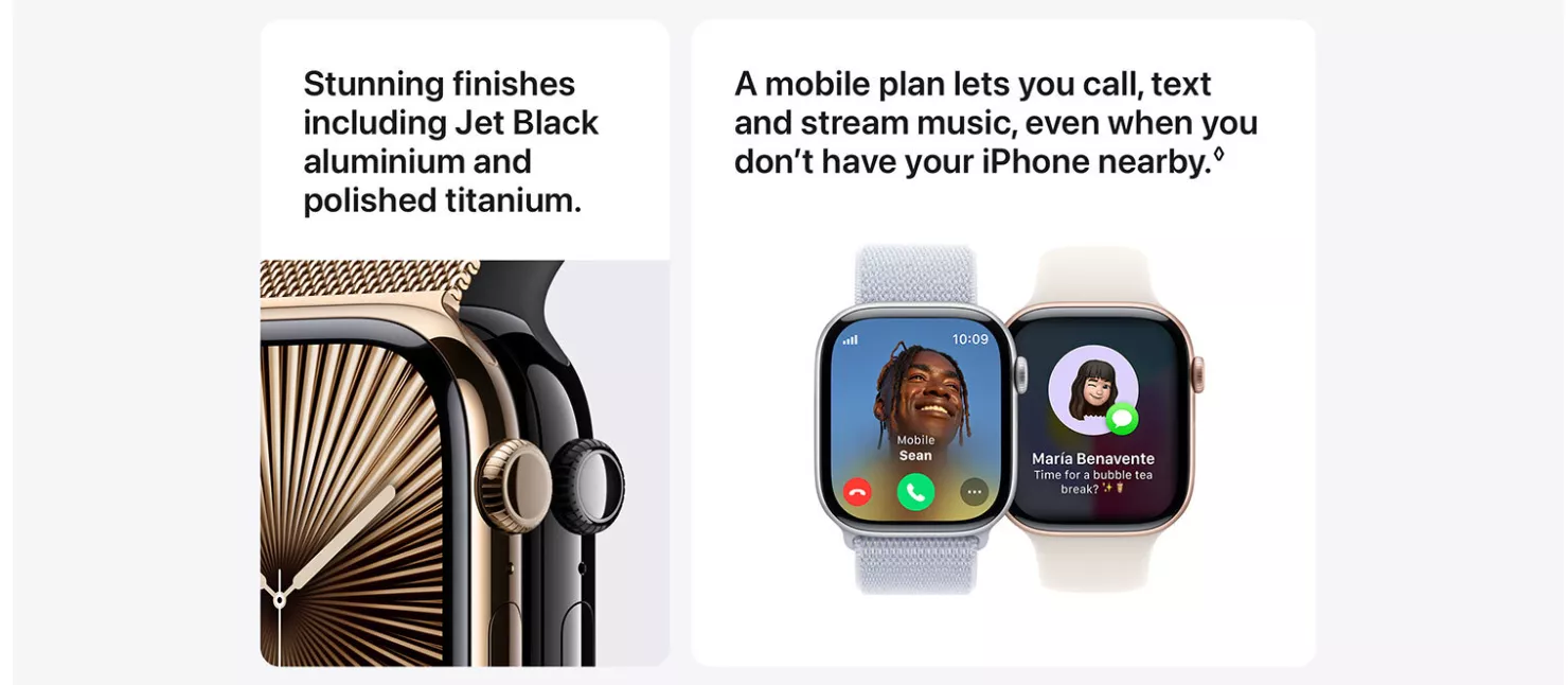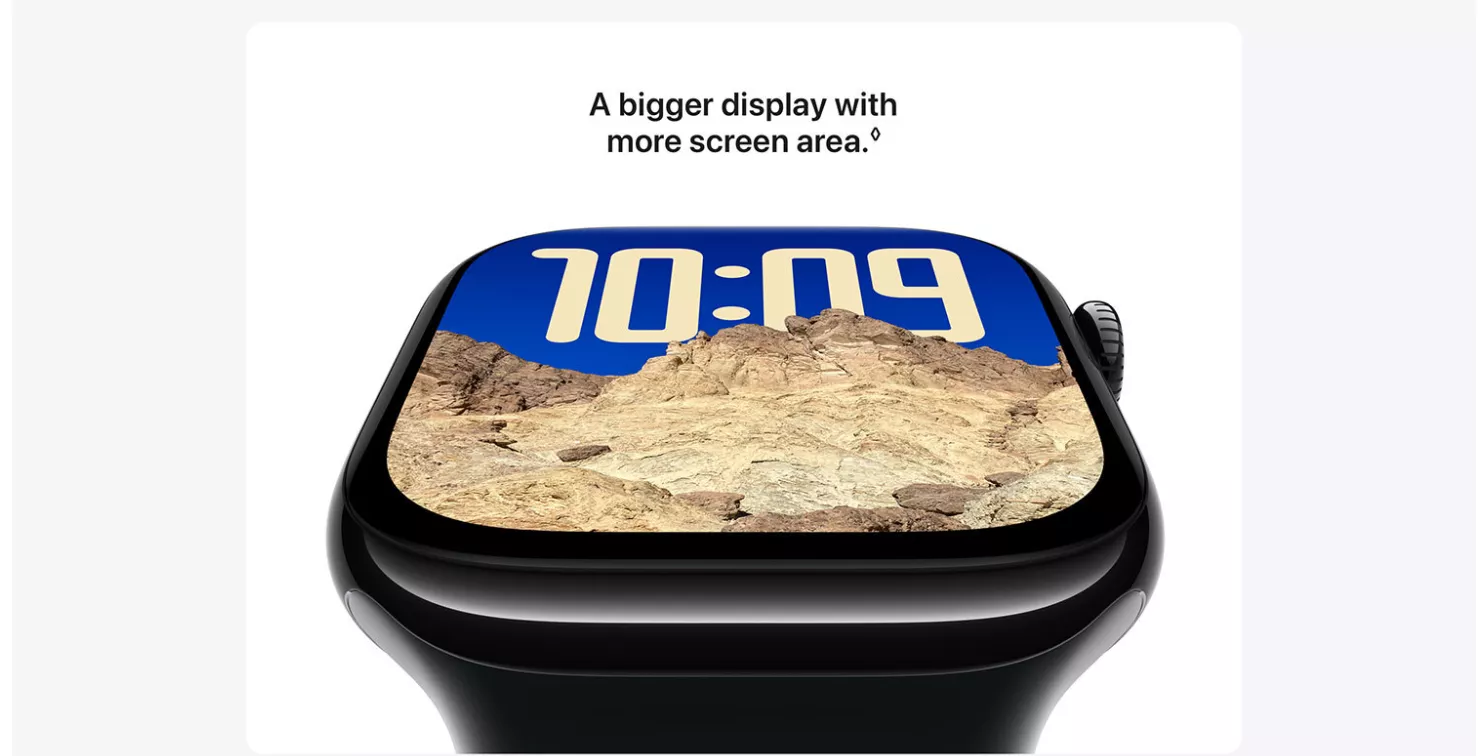 Thinstant classic. Biggest display. Thinnest design. Ever. Biggest display. Big-time upgrade. Meet Apple Watch Series 10. A bigger display with more screen area and a thinner, lighter design. Get advanced fitness and health features with Sleep Apnoea Notifications, faster charging. Why Apple Watch Series 10 - Bigger display with up to 30 percent more screen area. Advanced health and fitness features provide invaluable insights. Safety features connect you to help when you need it. Faster charging gives you 80 percent battery in about 30 minutes.