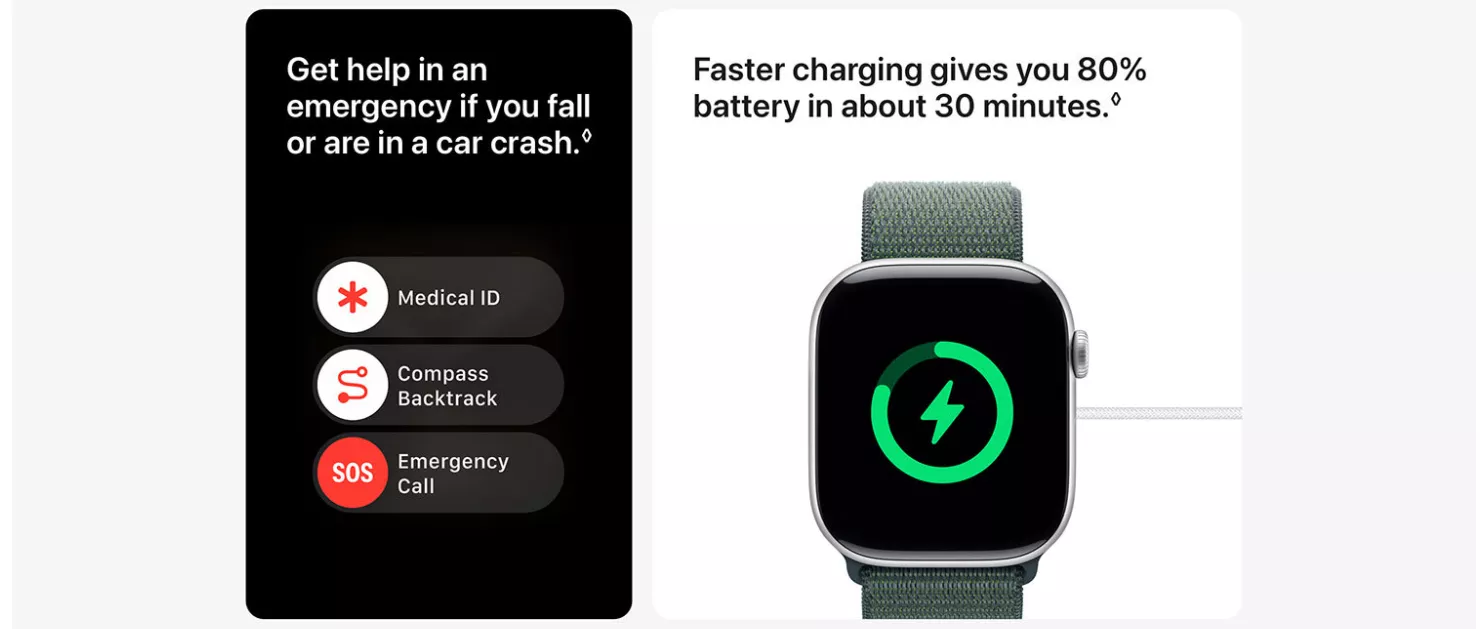 Innovative Safety Features - Fall Detection and Crash Detection can connect you to emergency services in the event of a hard fall or a serious car crash. Emergency SOS lets you call for help with the press of a button. Automatically notifies a loved one when you've arrived at your destination.