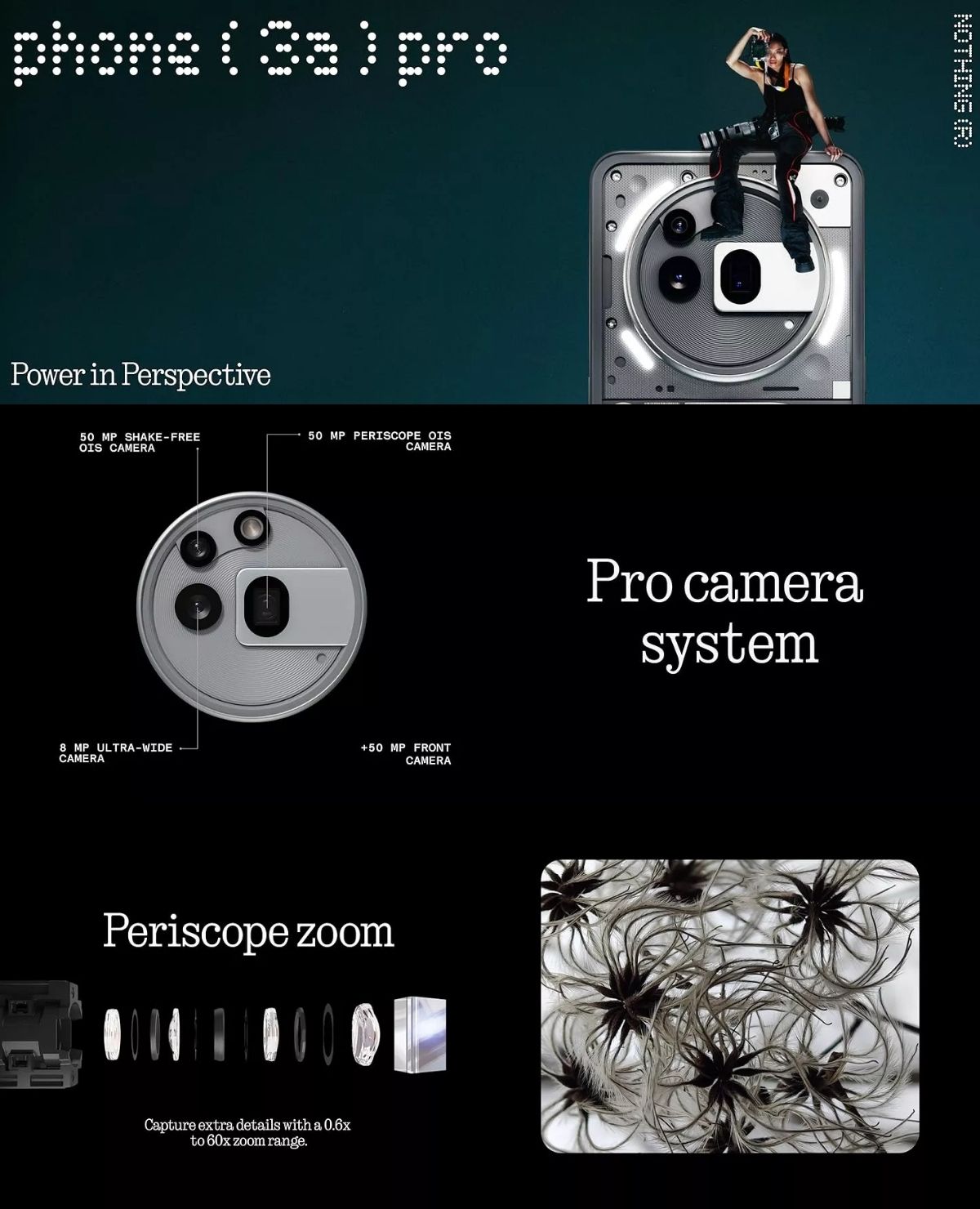 50 MP periscope telephoto (3× optical zoom + 60× AI zoom) with OIS,