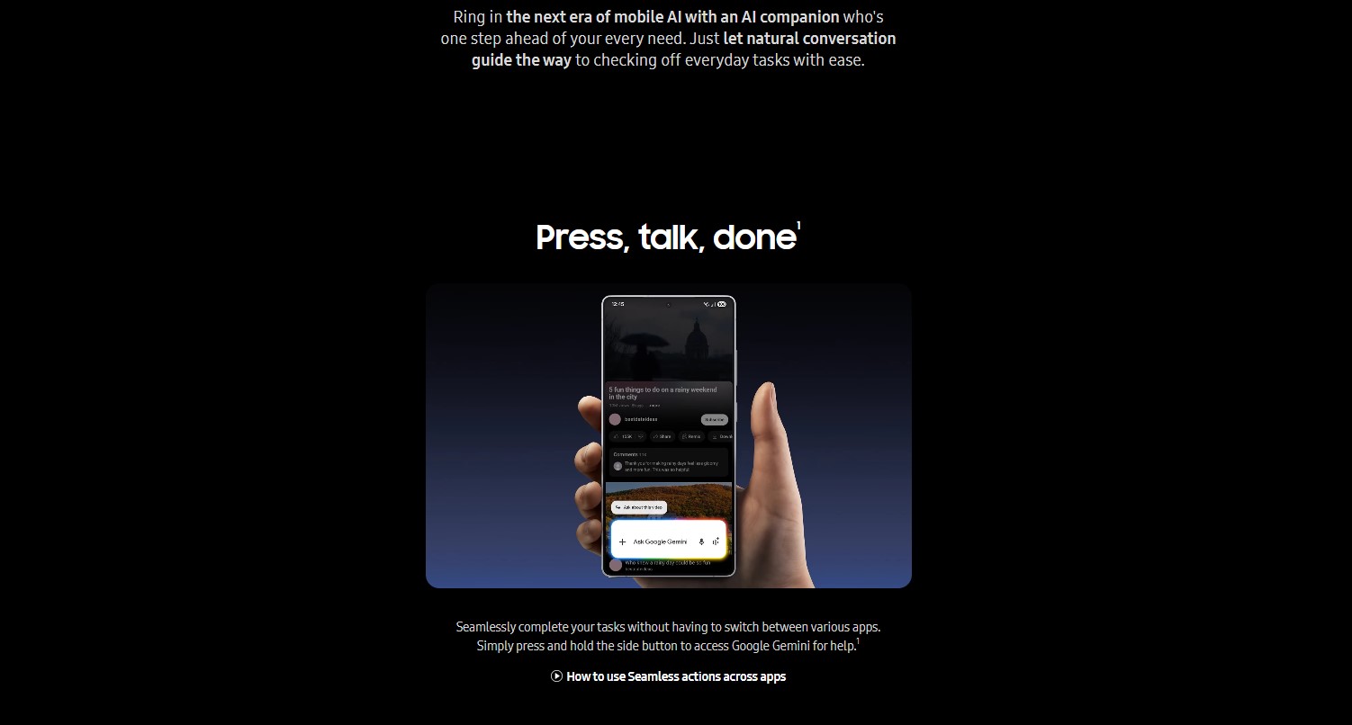 Breeze through your day with superpowered Galaxy AI. The future of Galaxy AI is here. S25 Ultra boosts your everyday – just press and hold the power button and it'll take care of numerous tasks across different apps with a single voice command. Want to find pet-friendly restaurants and send the location to a friend? Easy just ask Galaxy S25 Ultra and it will show you all the relevant restaurants nearby then send them on.