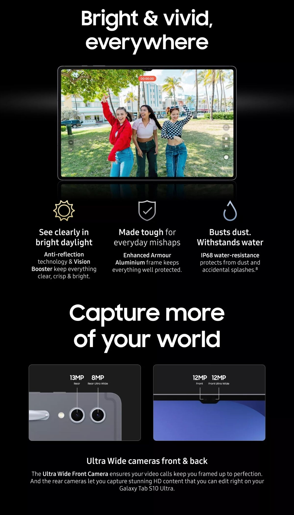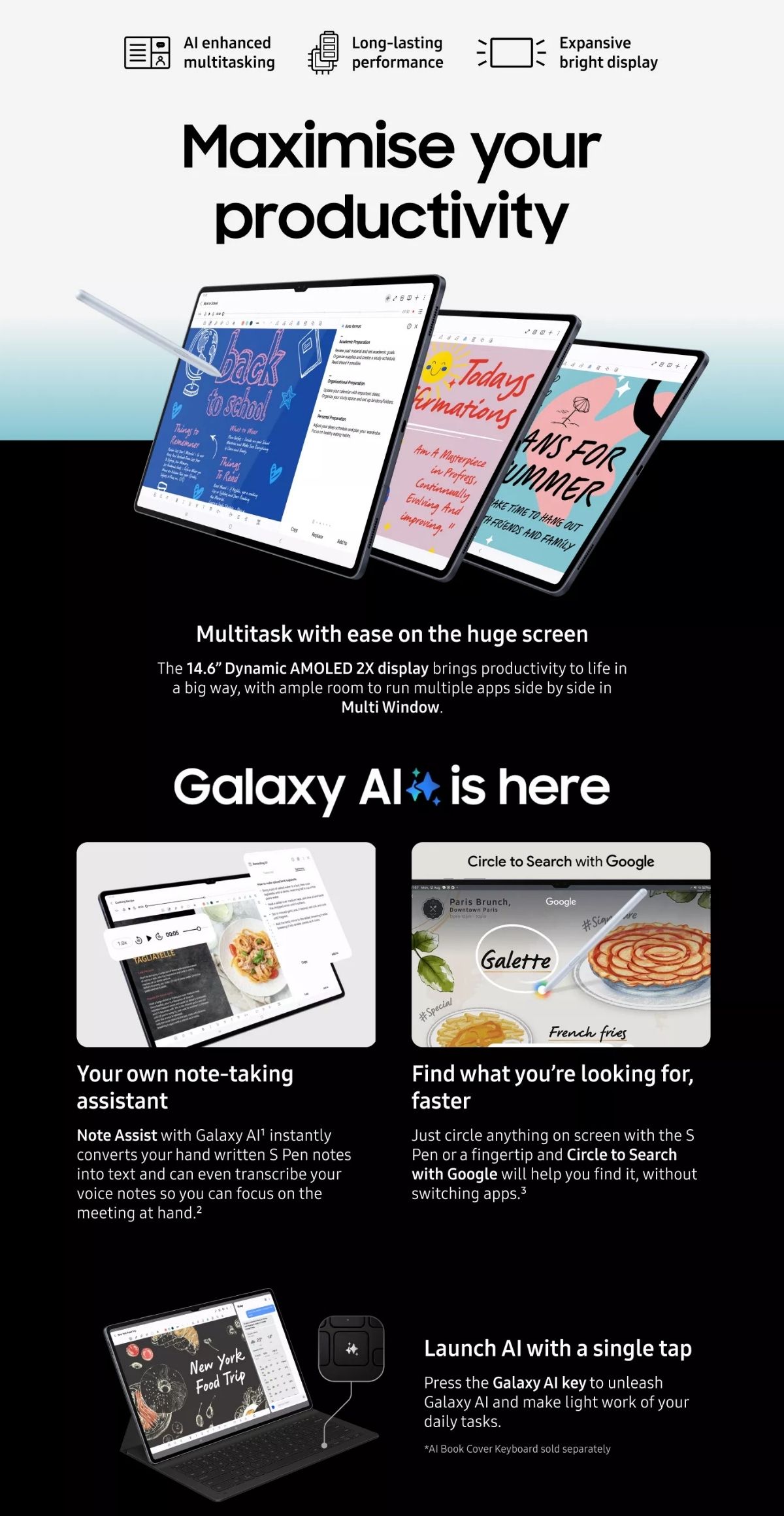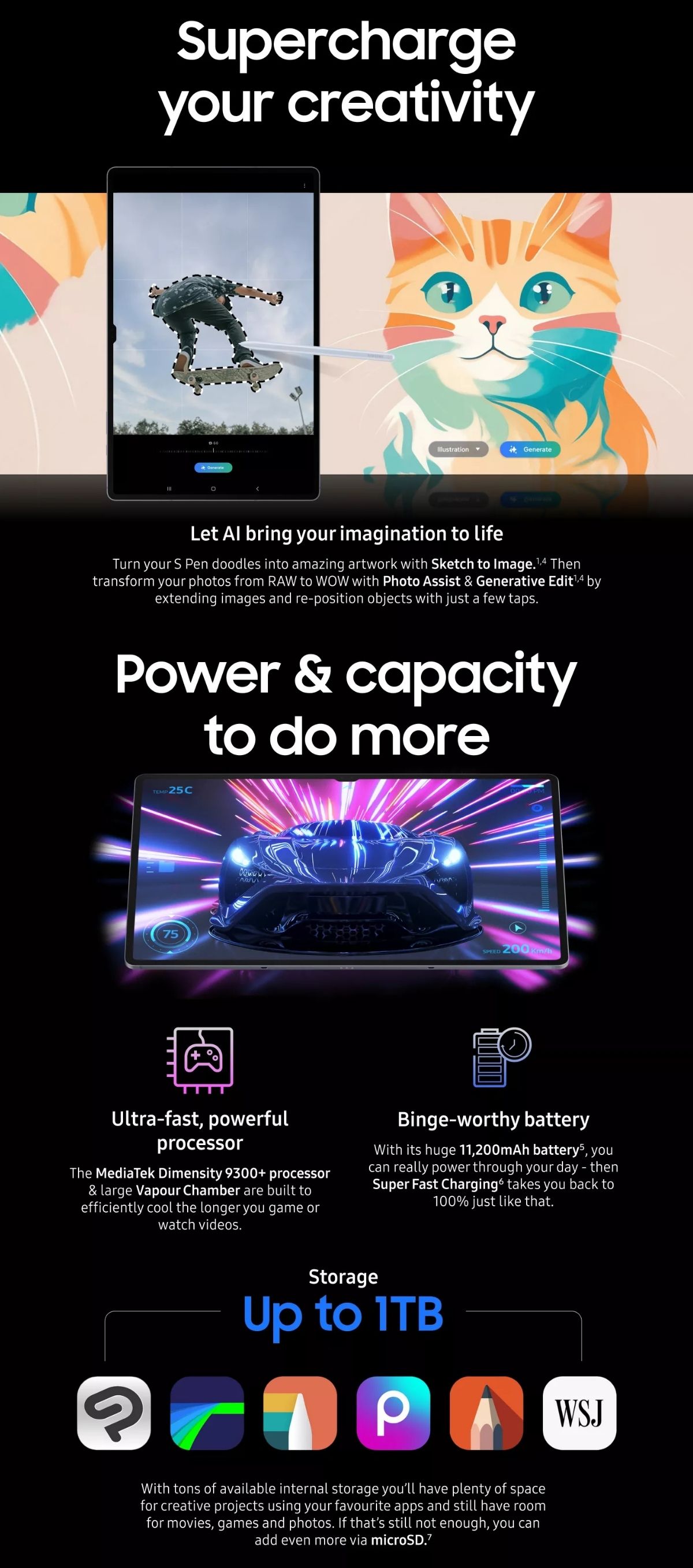 There's big, and then there's the Galaxy Tab S10 Ultra. The massive 14.6" Dynamic AMOLED 2X display lets you work, game, and stream in style. It's a real looker too, with a 3K resolution and 120 Hz refresh rate. Such an epic canvas needs a proper brush. And the included S Pen lets you scribble straight onto the screen. If you need help bringing your ideas to life, there's always Sketch to Image. It uses AI to turn your drawings into digital masterpieces. Talk about state of the art!